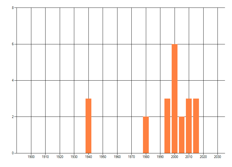 Het aantal atlasblokken (5x5 km) waarin de soort is gemeld binnen een periode van vijf jaar (vanaf 1980) of twintig jaar. Niet gecorrigeerd voor waarnemersinspanning en het aantal doorgegeven waarnemingen kan sterk variëren per periode, dus een trend in verspreiding kan hier niet direct uit worden afgelezen. Het opgegeven jaartal is het eerste jaar van de periode. Bron: gevalideerde waarnemingen uit de NDFF.