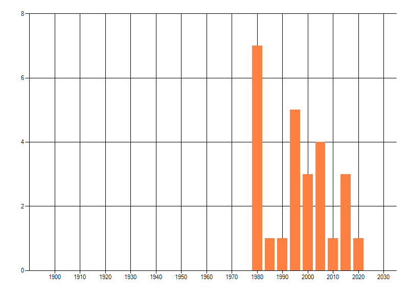 Het aantal atlasblokken (5x5 km) waarin de soort is gemeld binnen een periode van vijf jaar (vanaf 1980) of twintig jaar. Niet gecorrigeerd voor waarnemersinspanning en het aantal doorgegeven waarnemingen kan sterk variëren per periode, dus een trend in verspreiding kan hier niet direct uit worden afgelezen. Het opgegeven jaartal is het eerste jaar van de periode. Bron: gevalideerde waarnemingen uit de NDFF.