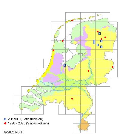 Het aantal atlasblokken (5x5 km) waarin de soort is gemeld binnen een periode van vijf jaar (vanaf 1980) of twintig jaar. Niet gecorrigeerd voor waarnemersinspanning en het aantal doorgegeven waarnemingen kan sterk variëren per periode, dus een trend in verspreiding kan hier niet direct uit worden afgelezen. Het opgegeven jaartal is het eerste jaar van de periode. Bron: gevalideerde waarnemingen uit de NDFF.