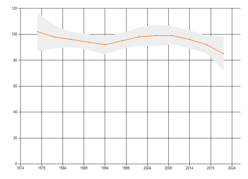 Gemiddelde trend van het aantal kilometerhokken waarin de soort voorkomt, weergegeven als indexcijfer (1975-1978 = 100).