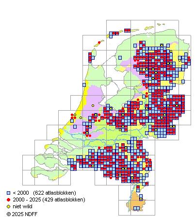 CC BY-NC-SA 3.0 NLVerspreidingNederlandVrij zeldzaam in het oosten en midden van het land en zeer zeldzaam in laagveengebieden en op de Waddeneilanden.
