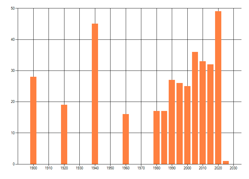 Het aantal atlasblokken (5x5 km) waarin de soort is gemeld binnen een periode van vijf jaar (vanaf 1980) of twintig jaar. Niet gecorrigeerd voor waarnemersinspanning en het aantal doorgegeven waarnemingen kan sterk variëren per periode, dus een trend in verspreiding kan hier niet direct uit worden afgelezen. Het opgegeven jaartal is het eerste jaar van de periode. Bron: gevalideerde waarnemingen uit de NDFF.