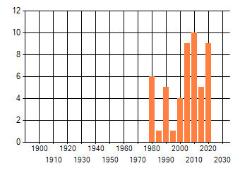 Het aantal atlasblokken (5x5 km) waarin de soort is gemeld binnen een periode van vijf jaar (vanaf 1980) of twintig jaar. Niet gecorrigeerd voor waarnemersinspanning en het aantal doorgegeven waarnemingen kan sterk variëren per periode, dus een trend in verspreiding kan hier niet direct uit worden afgelezen. Het opgegeven jaartal is het eerste jaar van de periode. Bron: gevalideerde waarnemingen uit de NDFF.