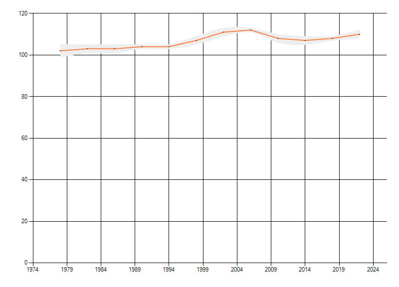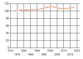 Gemiddelde trend van het aantal kilometerhokken waarin de soort voorkomt, weergegeven als indexcijfer (1975-1978 = 100).