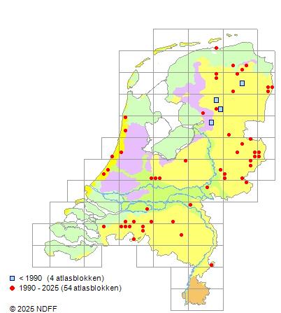 Het aantal atlasblokken (5x5 km) waarin de soort is gemeld binnen een periode van vijf jaar (vanaf 1980) of twintig jaar. Niet gecorrigeerd voor waarnemersinspanning en het aantal doorgegeven waarnemingen kan sterk variëren per periode, dus een trend in verspreiding kan hier niet direct uit worden afgelezen. Het opgegeven jaartal is het eerste jaar van de periode. Bron: gevalideerde waarnemingen uit de NDFF.