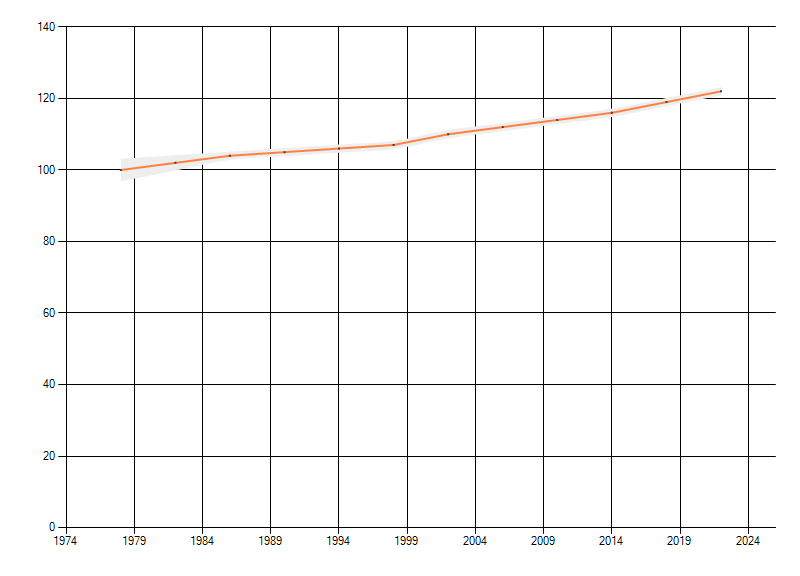 Gemiddelde trend van het aantal kilometerhokken waarin de soort voorkomt, weergegeven als indexcijfer (1975-1978 = 100). De trend is gecorrigeerd voor waarnemersinspanning en geeft de relatieve verandering in het aantal bezette kilometerhokken weer. Voor de berekening worden de data per periode van vier jaar samengenomen. In de grafiek correspondeert ieder punt met het laatste jaar van zo'n periode.