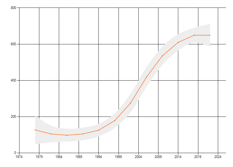 Gemiddelde trend van het aantal kilometerhokken waarin de soort voorkomt, weergegeven als indexcijfer (1975-1978 = 100). De trend is gecorrigeerd voor waarnemersinspanning en geeft de relatieve verandering in het aantal bezette kilometerhokken weer. Voor de berekening worden de data per periode van vier jaar samengenomen. In de grafiek correspondeert ieder punt met het laatste jaar van zo'n periode.