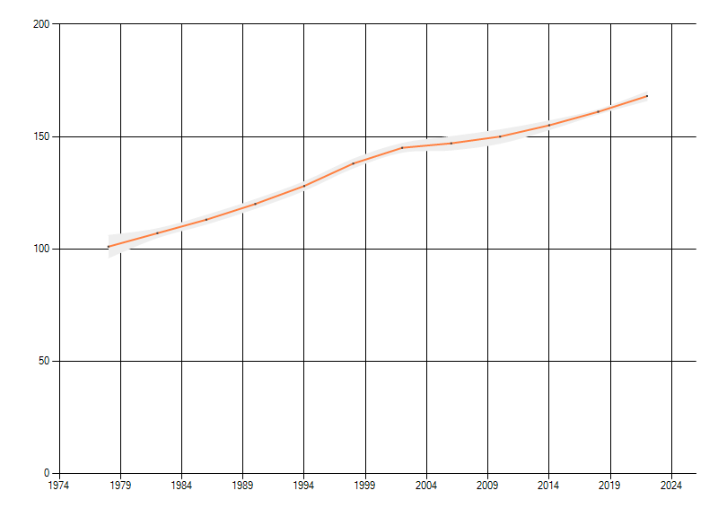 Gemiddelde trend van het aantal kilometerhokken waarin de soort voorkomt, weergegeven als indexcijfer (1975-1978 = 100).