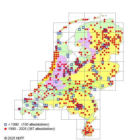 Het aantal atlasblokken (5x5 km) waarin de soort is gemeld binnen een periode van vijf jaar (vanaf 1980) of twintig jaar. Niet gecorrigeerd voor waarnemersinspanning en het aantal doorgegeven waarnemingen kan sterk variëren per periode, dus een trend in verspreiding kan hier niet direct uit worden afgelezen. Het opgegeven jaartal is het eerste jaar van de periode. Bron: gevalideerde waarnemingen uit de NDFF.