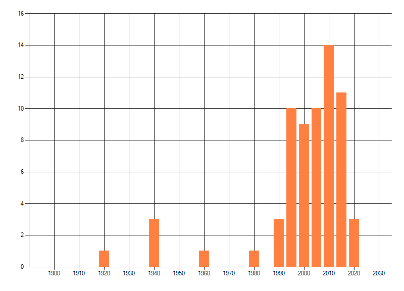 Het aantal atlasblokken (5x5 km) waarin de soort is gemeld binnen een periode van vijf jaar (vanaf 1980) of twintig jaar. Niet gecorrigeerd voor waarnemersinspanning en het aantal doorgegeven waarnemingen kan sterk variëren per periode, dus een trend in verspreiding kan hier niet direct uit worden afgelezen. Het opgegeven jaartal is het eerste jaar van de periode. Bron: gevalideerde waarnemingen uit de NDFF.