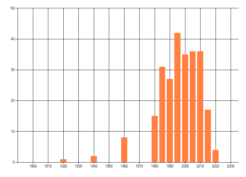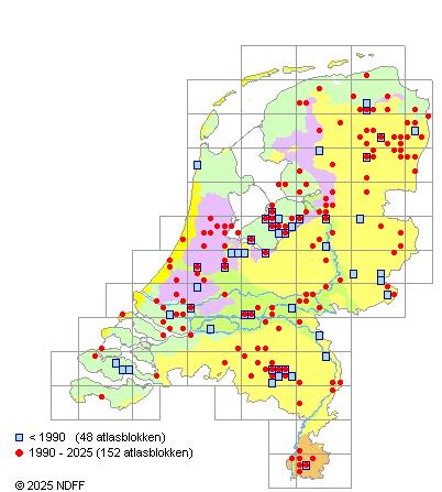 Het aantal atlasblokken (5x5 km) waarin de soort is gemeld binnen een periode van vijf jaar (vanaf 1980) of twintig jaar. Niet gecorrigeerd voor waarnemersinspanning en het aantal doorgegeven waarnemingen kan sterk variëren per periode, dus een trend in verspreiding kan hier niet direct uit worden afgelezen. Het opgegeven jaartal is het eerste jaar van de periode. Bron: gevalideerde waarnemingen uit de NDFF.
