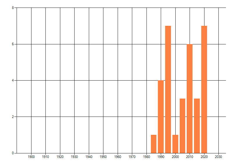 Het aantal atlasblokken (5x5 km) waarin de soort is gemeld binnen een periode van vijf jaar (vanaf 1980) of twintig jaar. Niet gecorrigeerd voor waarnemersinspanning en het aantal doorgegeven waarnemingen kan sterk variëren per periode, dus een trend in verspreiding kan hier niet direct uit worden afgelezen. Het opgegeven jaartal is het eerste jaar van de periode. Bron: gevalideerde waarnemingen uit de NDFF.