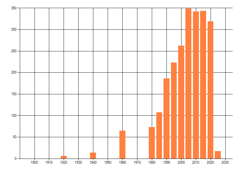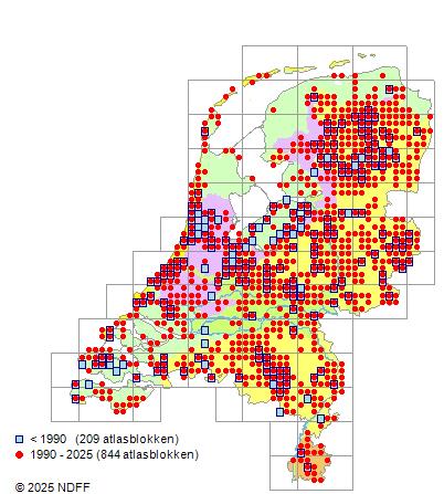 Het aantal atlasblokken (5x5 km) waarin de soort is gemeld binnen een periode van vijf jaar (vanaf 1980) of twintig jaar. Niet gecorrigeerd voor waarnemersinspanning en het aantal doorgegeven waarnemingen kan sterk variëren per periode, dus een trend in verspreiding kan hier niet direct uit worden afgelezen. Het opgegeven jaartal is het eerste jaar van de periode. Bron: gevalideerde waarnemingen uit de NDFF.