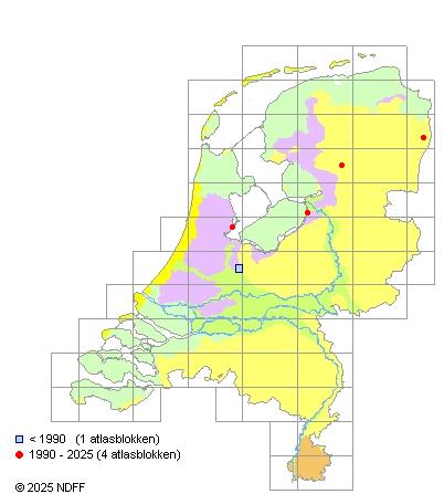 Het aantal atlasblokken (5x5 km) waarin de soort is gemeld binnen een periode van vijf jaar (vanaf 1980) of twintig jaar. Niet gecorrigeerd voor waarnemersinspanning en het aantal doorgegeven waarnemingen kan sterk variëren per periode, dus een trend in verspreiding kan hier niet direct uit worden afgelezen. Het opgegeven jaartal is het eerste jaar van de periode. Bron: gevalideerde waarnemingen uit de NDFF.
