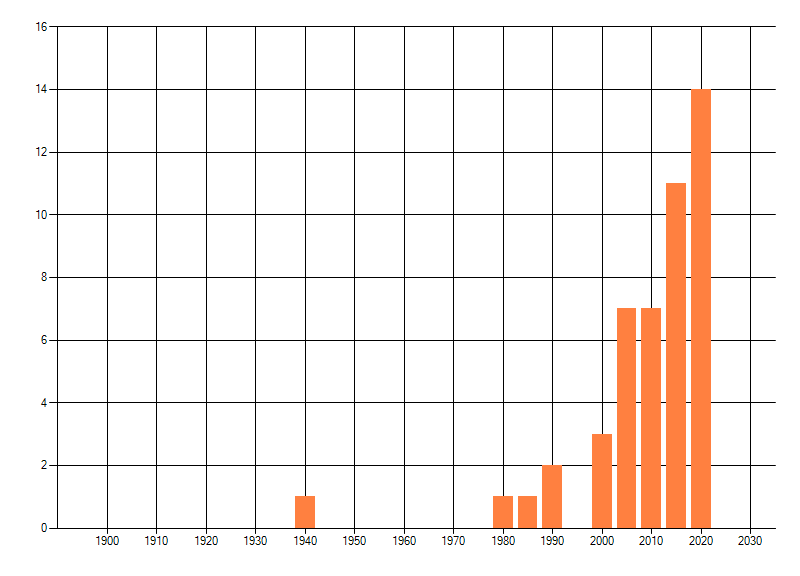 Het aantal atlasblokken (5x5 km) waarin de soort is gemeld binnen een periode van vijf jaar (vanaf 1980) of twintig jaar. Niet gecorrigeerd voor waarnemersinspanning en het aantal doorgegeven waarnemingen kan sterk variëren per periode, dus een trend in verspreiding kan hier niet direct uit worden afgelezen. Het opgegeven jaartal is het eerste jaar van de periode. Bron: gevalideerde waarnemingen uit de NDFF.