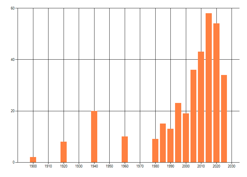 Het aantal atlasblokken (5x5 km) waarin de soort is gemeld binnen een periode van vijf jaar (vanaf 1980) of twintig jaar. Niet gecorrigeerd voor waarnemersinspanning en het aantal doorgegeven waarnemingen kan sterk variƫren per periode, dus een trend in verspreiding kan hier niet direct uit worden afgelezen. Het opgegeven jaartal is het eerste jaar van de periode. Bron: gevalideerde waarnemingen uit de NDFF.