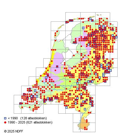 Het aantal atlasblokken (5x5 km) waarin de soort is gemeld binnen een periode van vijf jaar (vanaf 1980) of twintig jaar. Niet gecorrigeerd voor waarnemersinspanning en het aantal doorgegeven waarnemingen kan sterk variëren per periode, dus een trend in verspreiding kan hier niet direct uit worden afgelezen. Het opgegeven jaartal is het eerste jaar van de periode. Bron: gevalideerde waarnemingen uit de NDFF.