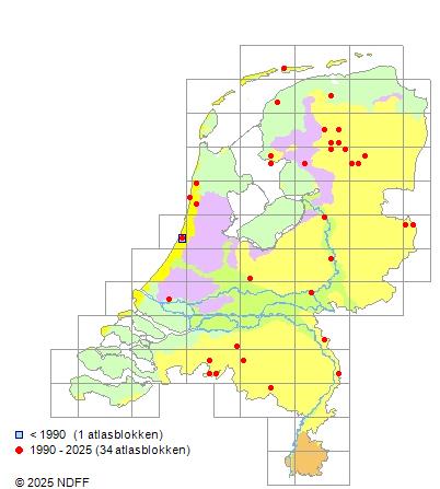 Het aantal atlasblokken (5x5 km) waarin de soort is gemeld binnen een periode van vijf jaar (vanaf 1980) of twintig jaar. Niet gecorrigeerd voor waarnemersinspanning en het aantal doorgegeven waarnemingen kan sterk variëren per periode, dus een trend in verspreiding kan hier niet direct uit worden afgelezen. Het opgegeven jaartal is het eerste jaar van de periode. Bron: gevalideerde waarnemingen uit de NDFF.
