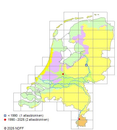 Het aantal atlasblokken (5x5 km) waarin de soort is gemeld binnen een periode van vijf jaar (vanaf 1980) of twintig jaar. Niet gecorrigeerd voor waarnemersinspanning en het aantal doorgegeven waarnemingen kan sterk variëren per periode, dus een trend in verspreiding kan hier niet direct uit worden afgelezen. Het opgegeven jaartal is het eerste jaar van de periode. Bron: gevalideerde waarnemingen uit de NDFF.