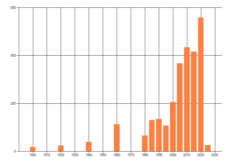 Het aantal atlasblokken (5x5 km) waarin de soort is gemeld binnen een periode van vijf jaar (vanaf 1980) of twintig jaar. Niet gecorrigeerd voor waarnemersinspanning en het aantal doorgegeven waarnemingen kan sterk variëren per periode, dus een trend in verspreiding kan hier niet direct uit worden afgelezen. Het opgegeven jaartal is het eerste jaar van de periode. Bron: gevalideerde waarnemingen uit de NDFF.