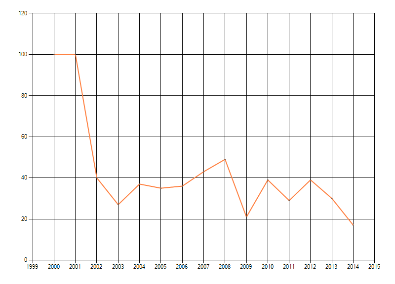 Trend in het geschatte aantal individuen van paddenstoelen in bossen op de hoge zandgronden, weergegeven als indexcijfer (eerste jaar = 100). Bron: