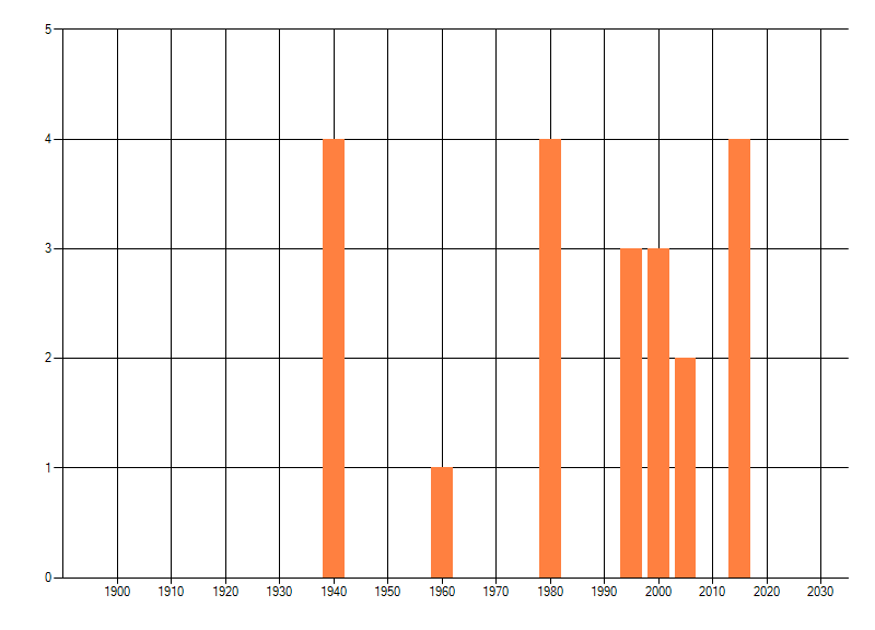 Het aantal atlasblokken (5x5 km) waarin de soort is gemeld binnen een periode van vijf jaar (vanaf 1980) of twintig jaar. Niet gecorrigeerd voor waarnemersinspanning en het aantal doorgegeven waarnemingen kan sterk variëren per periode, dus een trend in verspreiding kan hier niet direct uit worden afgelezen. Het opgegeven jaartal is het eerste jaar van de periode. Bron: gevalideerde waarnemingen uit de NDFF.