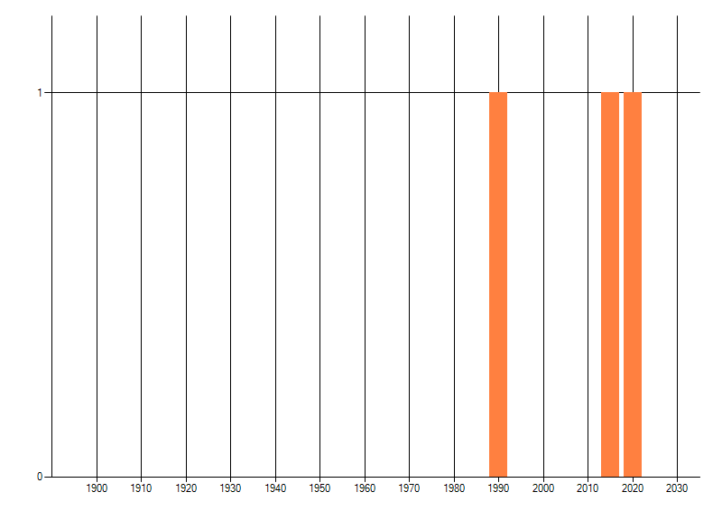 Het aantal atlasblokken (5x5 km) waarin de soort is gemeld binnen een periode van vijf jaar (vanaf 1980) of twintig jaar. Niet gecorrigeerd voor waarnemersinspanning en het aantal doorgegeven waarnemingen kan sterk variëren per periode, dus een trend in verspreiding kan hier niet direct uit worden afgelezen. Het opgegeven jaartal is het eerste jaar van de periode. Bron: gevalideerde waarnemingen uit de NDFF.