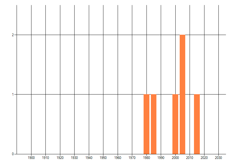 Het aantal atlasblokken (5x5 km) waarin de soort is gemeld binnen een periode van vijf jaar (vanaf 1980) of twintig jaar. Niet gecorrigeerd voor waarnemersinspanning en het aantal doorgegeven waarnemingen kan sterk variëren per periode, dus een trend in verspreiding kan hier niet direct uit worden afgelezen. Het opgegeven jaartal is het eerste jaar van de periode. Bron: gevalideerde waarnemingen uit de NDFF.
