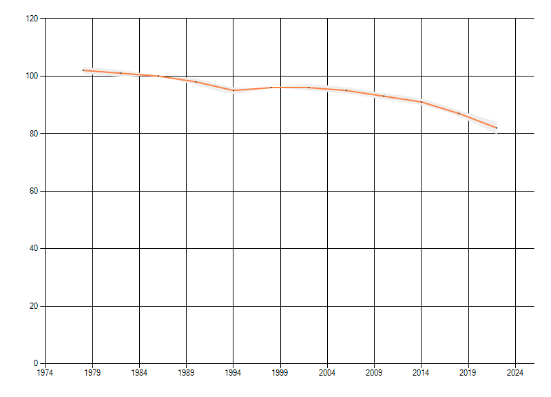 Gemiddelde trend van het aantal kilometerhokken waarin de soort voorkomt, weergegeven als indexcijfer (1975-1978 = 100).