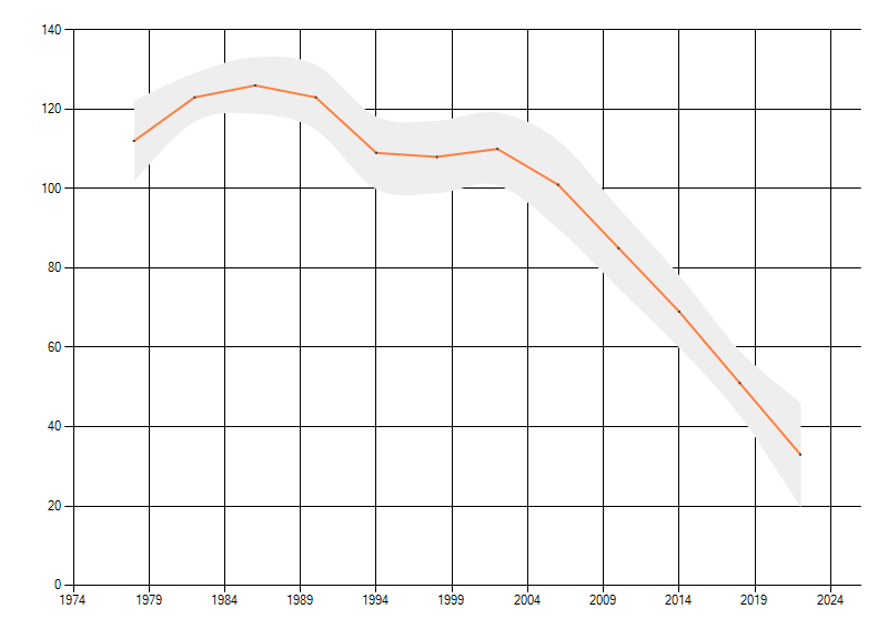 Gemiddelde trend van het aantal kilometerhokken waarin de soort voorkomt, weergegeven als indexcijfer (1975-1978 = 100).