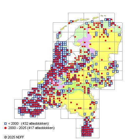 CC BY-NC-SA 3.0 NLVerspreidingNederlandVrij algemeen in het westen van het land, in laagveengebieden, in het noordelijk zeekleigebied en in Zuid-Limburg, vrij zeldzaam in Flevoland en zeldzaam in de Hollandse en Zeeuwse duinen en in het oosten van het land. Elders zeer zeldzaam.