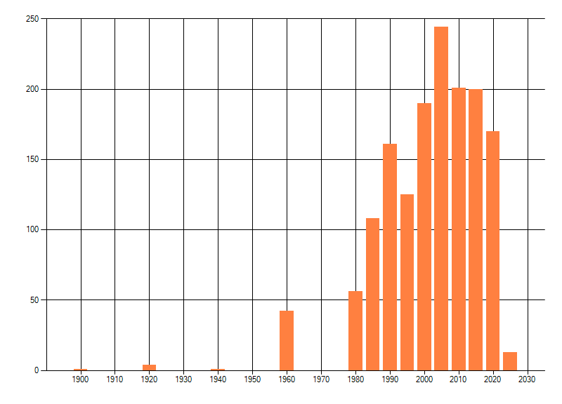 Het aantal atlasblokken (5x5 km) waarin de soort is gemeld binnen een periode van vijf jaar (vanaf 1980) of twintig jaar. Niet gecorrigeerd voor waarnemersinspanning en het aantal doorgegeven waarnemingen kan sterk variëren per periode, dus een trend in verspreiding kan hier niet direct uit worden afgelezen. Het opgegeven jaartal is het eerste jaar van de periode. Bron: gevalideerde waarnemingen uit de NDFF.