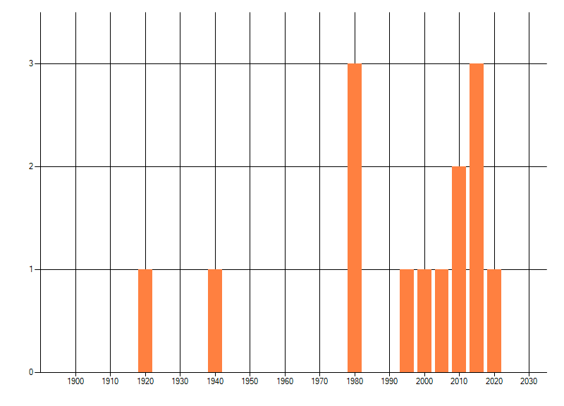 Het aantal atlasblokken (5x5 km) waarin de soort is gemeld binnen een periode van vijf jaar (vanaf 1980) of twintig jaar. Niet gecorrigeerd voor waarnemersinspanning en het aantal doorgegeven waarnemingen kan sterk variëren per periode, dus een trend in verspreiding kan hier niet direct uit worden afgelezen. Het opgegeven jaartal is het eerste jaar van de periode. Bron: gevalideerde waarnemingen uit de NDFF.