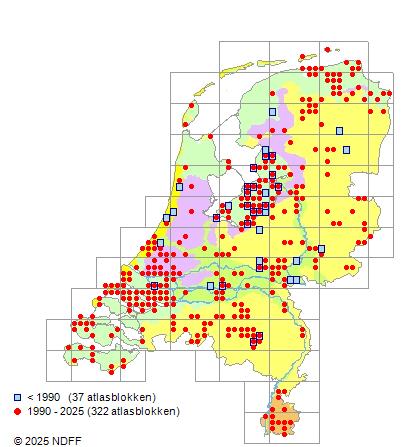 Het aantal atlasblokken (5x5 km) waarin de soort is gemeld binnen een periode van vijf jaar (vanaf 1980) of twintig jaar. Niet gecorrigeerd voor waarnemersinspanning en het aantal doorgegeven waarnemingen kan sterk variëren per periode, dus een trend in verspreiding kan hier niet direct uit worden afgelezen. Het opgegeven jaartal is het eerste jaar van de periode. Bron: gevalideerde waarnemingen uit de NDFF.