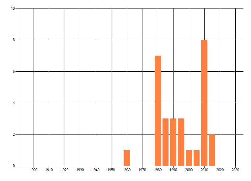 Het aantal atlasblokken (5x5 km) waarin de soort is gemeld binnen een periode van vijf jaar (vanaf 1980) of twintig jaar. Niet gecorrigeerd voor waarnemersinspanning en het aantal doorgegeven waarnemingen kan sterk variëren per periode, dus een trend in verspreiding kan hier niet direct uit worden afgelezen. Het opgegeven jaartal is het eerste jaar van de periode. Bron: gevalideerde waarnemingen uit de NDFF.