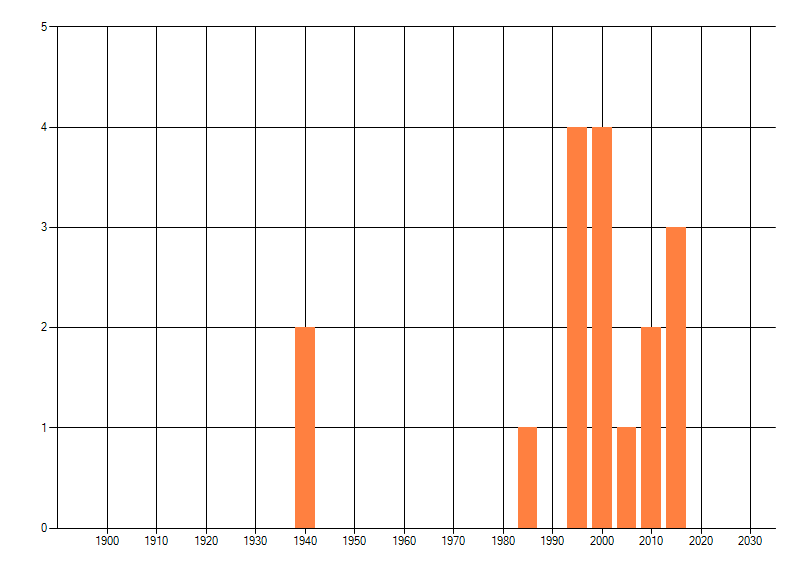 Het aantal atlasblokken (5x5 km) waarin de soort is gemeld binnen een periode van vijf jaar (vanaf 1980) of twintig jaar. Niet gecorrigeerd voor waarnemersinspanning en het aantal doorgegeven waarnemingen kan sterk variëren per periode, dus een trend in verspreiding kan hier niet direct uit worden afgelezen. Het opgegeven jaartal is het eerste jaar van de periode. Bron: gevalideerde waarnemingen uit de NDFF.
