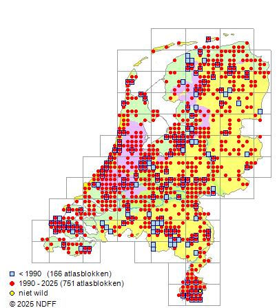 Het aantal atlasblokken (5x5 km) waarin de soort is gemeld binnen een periode van vijf jaar (vanaf 1980) of twintig jaar. Niet gecorrigeerd voor waarnemersinspanning en het aantal doorgegeven waarnemingen kan sterk variƫren per periode, dus een trend in verspreiding kan hier niet direct uit worden afgelezen. Het opgegeven jaartal is het eerste jaar van de periode. Bron: gevalideerde waarnemingen uit de NDFF.