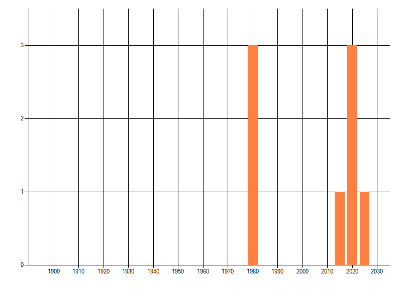 Het aantal atlasblokken (5x5 km) waarin de soort is gemeld binnen een periode van vijf jaar (vanaf 1980) of twintig jaar. Niet gecorrigeerd voor waarnemersinspanning en het aantal doorgegeven waarnemingen kan sterk variëren per periode, dus een trend in verspreiding kan hier niet direct uit worden afgelezen. Het opgegeven jaartal is het eerste jaar van de periode. Bron: gevalideerde waarnemingen uit de NDFF.