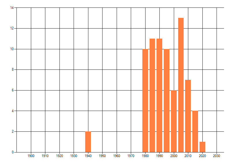 Het aantal atlasblokken (5x5 km) waarin de soort is gemeld binnen een periode van vijf jaar (vanaf 1980) of twintig jaar. Niet gecorrigeerd voor waarnemersinspanning en het aantal doorgegeven waarnemingen kan sterk variëren per periode, dus een trend in verspreiding kan hier niet direct uit worden afgelezen. Het opgegeven jaartal is het eerste jaar van de periode. Bron: gevalideerde waarnemingen uit de NDFF.