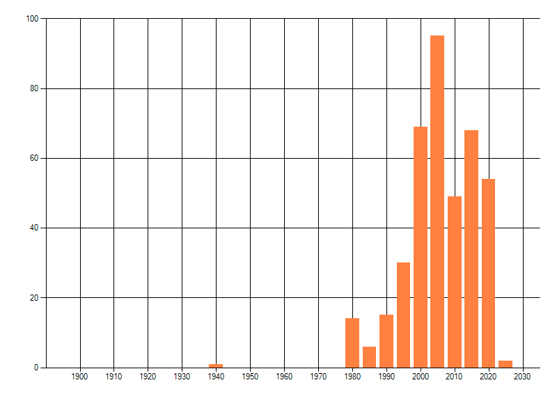 Het aantal atlasblokken (5x5 km) waarin de soort is gemeld binnen een periode van vijf jaar (vanaf 1980) of twintig jaar. Niet gecorrigeerd voor waarnemersinspanning en het aantal doorgegeven waarnemingen kan sterk variëren per periode, dus een trend in verspreiding kan hier niet direct uit worden afgelezen. Het opgegeven jaartal is het eerste jaar van de periode. Bron: gevalideerde waarnemingen uit de NDFF.