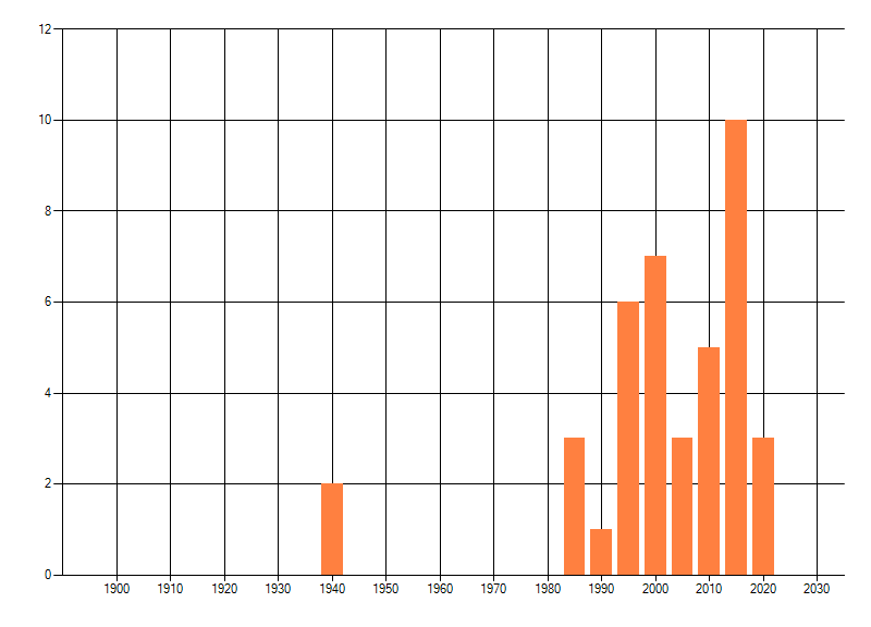 Het aantal atlasblokken (5x5 km) waarin de soort is gemeld binnen een periode van vijf jaar (vanaf 1980) of twintig jaar. Niet gecorrigeerd voor waarnemersinspanning en het aantal doorgegeven waarnemingen kan sterk variëren per periode, dus een trend in verspreiding kan hier niet direct uit worden afgelezen. Het opgegeven jaartal is het eerste jaar van de periode. Bron: gevalideerde waarnemingen uit de NDFF.