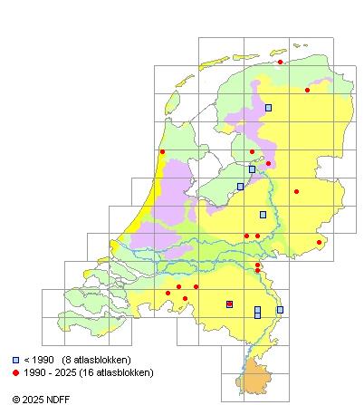 Het aantal atlasblokken (5x5 km) waarin de soort is gemeld binnen een periode van vijf jaar (vanaf 1980) of twintig jaar. Niet gecorrigeerd voor waarnemersinspanning en het aantal doorgegeven waarnemingen kan sterk variëren per periode, dus een trend in verspreiding kan hier niet direct uit worden afgelezen. Het opgegeven jaartal is het eerste jaar van de periode. Bron: gevalideerde waarnemingen uit de NDFF.