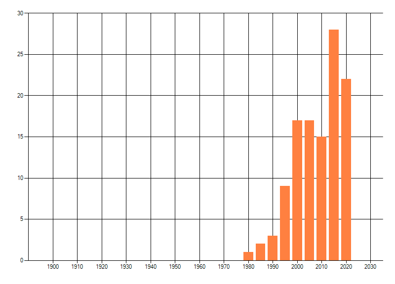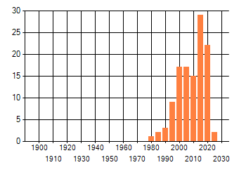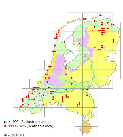 Het aantal atlasblokken (5x5 km) waarin de soort is gemeld binnen een periode van vijf jaar (vanaf 1980) of twintig jaar. Niet gecorrigeerd voor waarnemersinspanning en het aantal doorgegeven waarnemingen kan sterk variëren per periode, dus een trend in verspreiding kan hier niet direct uit worden afgelezen. Het opgegeven jaartal is het eerste jaar van de periode. Bron: gevalideerde waarnemingen uit de NDFF.