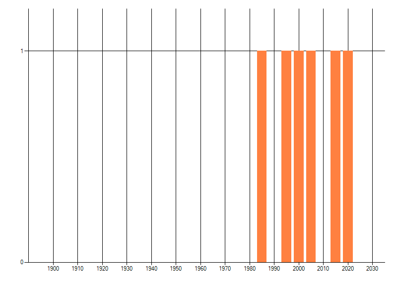 Het aantal atlasblokken (5x5 km) waarin de soort is gemeld binnen een periode van vijf jaar (vanaf 1980) of twintig jaar. Niet gecorrigeerd voor waarnemersinspanning en het aantal doorgegeven waarnemingen kan sterk variëren per periode, dus een trend in verspreiding kan hier niet direct uit worden afgelezen. Het opgegeven jaartal is het eerste jaar van de periode. Bron: gevalideerde waarnemingen uit de NDFF.