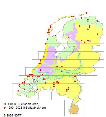 Het aantal atlasblokken (5x5 km) waarin de soort is gemeld binnen een periode van vijf jaar (vanaf 1980) of twintig jaar. Niet gecorrigeerd voor waarnemersinspanning en het aantal doorgegeven waarnemingen kan sterk variëren per periode, dus een trend in verspreiding kan hier niet direct uit worden afgelezen. Het opgegeven jaartal is het eerste jaar van de periode. Bron: gevalideerde waarnemingen uit de NDFF.