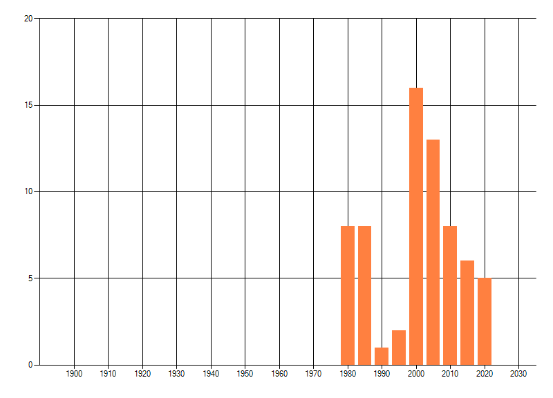 Het aantal atlasblokken (5x5 km) waarin de soort is gemeld binnen een periode van vijf jaar (vanaf 1980) of twintig jaar. Niet gecorrigeerd voor waarnemersinspanning en het aantal doorgegeven waarnemingen kan sterk variëren per periode, dus een trend in verspreiding kan hier niet direct uit worden afgelezen. Het opgegeven jaartal is het eerste jaar van de periode. Bron: gevalideerde waarnemingen uit de NDFF.