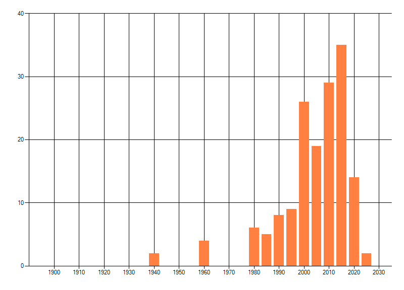 Het aantal atlasblokken (5x5 km) waarin de soort is gemeld binnen een periode van vijf jaar (vanaf 1980) of twintig jaar. Niet gecorrigeerd voor waarnemersinspanning en het aantal doorgegeven waarnemingen kan sterk variëren per periode, dus een trend in verspreiding kan hier niet direct uit worden afgelezen. Het opgegeven jaartal is het eerste jaar van de periode. Bron: gevalideerde waarnemingen uit de NDFF.