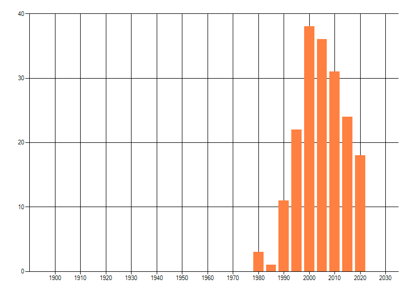 Het aantal atlasblokken (5x5 km) waarin de soort is gemeld binnen een periode van vijf jaar (vanaf 1980) of twintig jaar. Niet gecorrigeerd voor waarnemersinspanning en het aantal doorgegeven waarnemingen kan sterk variëren per periode, dus een trend in verspreiding kan hier niet direct uit worden afgelezen. Het opgegeven jaartal is het eerste jaar van de periode. Bron: gevalideerde waarnemingen uit de NDFF.