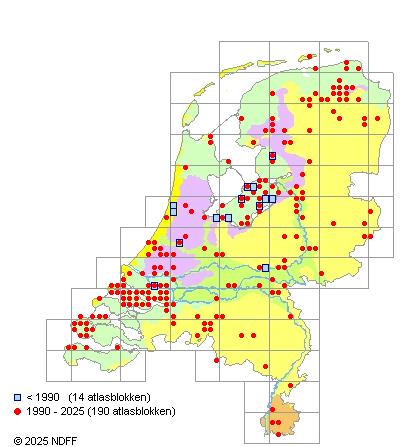 Het aantal atlasblokken (5x5 km) waarin de soort is gemeld binnen een periode van vijf jaar (vanaf 1980) of twintig jaar. Niet gecorrigeerd voor waarnemersinspanning en het aantal doorgegeven waarnemingen kan sterk variëren per periode, dus een trend in verspreiding kan hier niet direct uit worden afgelezen. Het opgegeven jaartal is het eerste jaar van de periode. Bron: gevalideerde waarnemingen uit de NDFF.