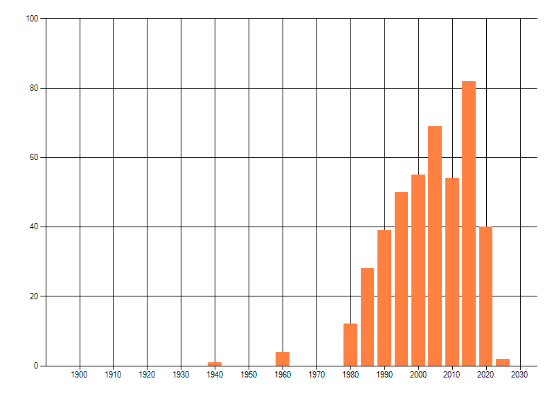 Het aantal atlasblokken (5x5 km) waarin de soort is gemeld binnen een periode van vijf jaar (vanaf 1980) of twintig jaar. Niet gecorrigeerd voor waarnemersinspanning en het aantal doorgegeven waarnemingen kan sterk variëren per periode, dus een trend in verspreiding kan hier niet direct uit worden afgelezen. Het opgegeven jaartal is het eerste jaar van de periode. Bron: gevalideerde waarnemingen uit de NDFF.